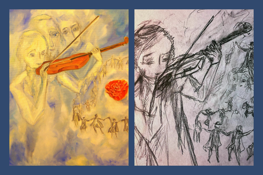 When Elie Wiesel saw the painting, he was deeply moved and asked Michael how did he know his story with the violin? We did not, at the time. So, a great writer told us a heart-rending story about the boy who loved to play his violin and did it exceptionally well. The boy himself, his family in Siget, Romania, and all their friends were positive that when the boy will grow up, he will become a performing violinist.